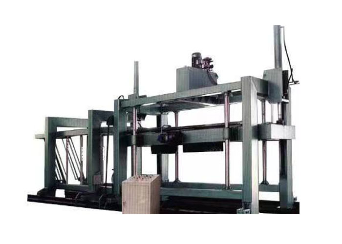 本廠生產(chǎn)的JFQ空中翻轉(zhuǎn)切割機是在德國伊通技術(shù)基礎(chǔ)上,結(jié)合國內(nèi)實際情況開發(fā)出的一種簡單、實用、高效的切割機組。翻轉(zhuǎn)吊具把模具空中翻轉(zhuǎn)90度后脫模把坯體連同模具側(cè)板放置在切割臺上,縱向切割裝置通過電機帶動自身行走,,對放置于切割臺上的坯體進行行走切割,切割完成后行走至?xí)和N恢茫瑱M向切割裝置通過電機帶動自身行走到坯體中央,停止后再進行水平式切割,橫切架自上而下垂直降落切割直至上升復(fù)位。